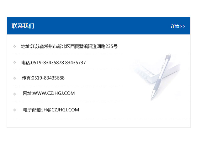 地址:常州市新北區友邦商務大廈1幢16、17層  電話:0519-85101652  傳真:0519-85112595  郵編:213022  網址:www_cz-jiayue_cn.whjieyou.com  郵箱:xiajifengaa@163.com